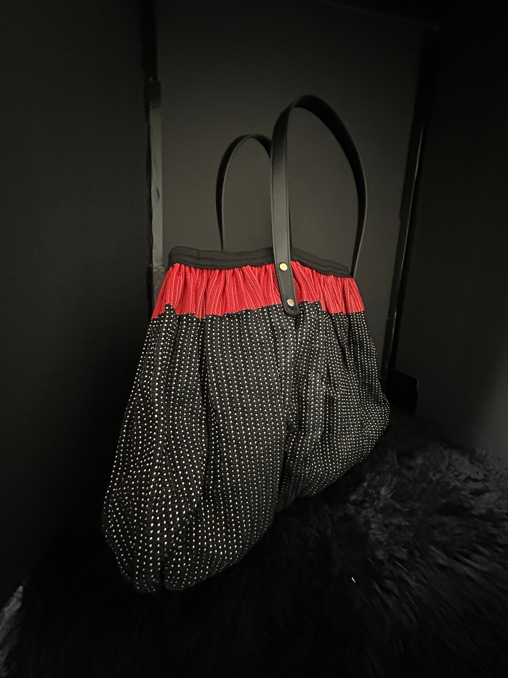 Elevate your style with this striking black and red purse. Featuring a vibrant, gathered red top and a spacious black body with a subtle dotted pattern, this tote is both playful and chic. Durable black straps complete the look. Perfect for any occasion, it's a show-stopper that's as unique as you are.